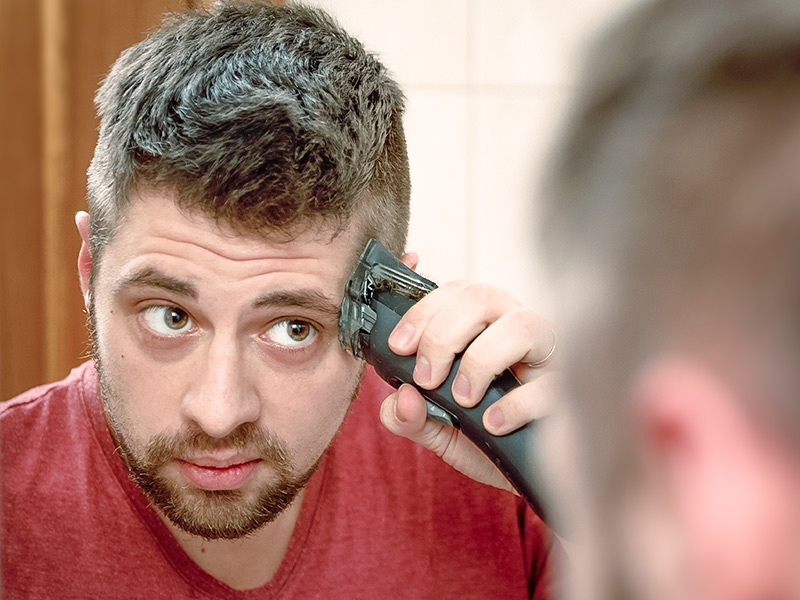 - Состричь волосы. Триммером, а если его нет — ножницами с расческой убираем волосы до минимальной длины. Вот повод развлечься, фигурно остригая шевелюру: ура, можно ни о чем не думать, эти волосы вам уже не понадобятся, впереди чистый лист, то есть череп! Главное, не переусердствовать — ножницами тоже иногда можно порезаться. Триммером — гораздо сложнее.